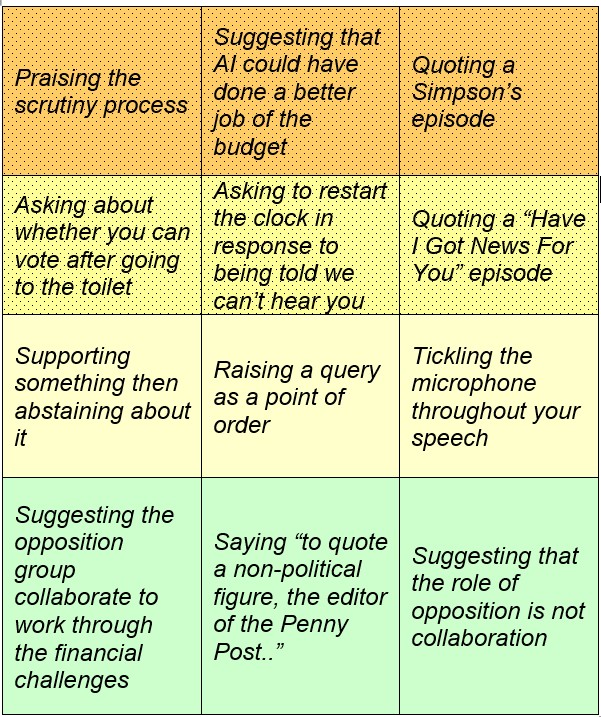 Not for a moment to downplay the financial challenge the forthcoming council tax rise may give residents, but if you plan to watch the (3hrs 40min) budget council meeting over the weekend - on YouTube HERE - you might like to have this handy Council Meeting Bingo card to hand, and see how many you get. |