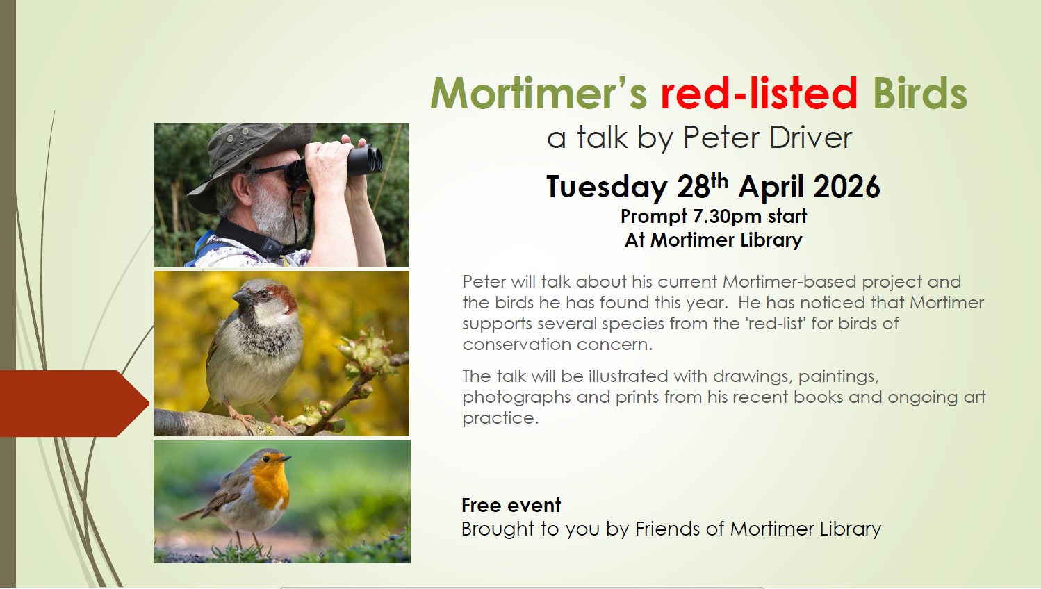 Keen ornithologist, writer and artist, Peter Driver, returns to talk about Mortimer’s red-listed birds. Having set himself a target in 2026 to find 100 bird species within his home patch of Mortimer, Peter discovered that Mortimer supports several species from the ‘red-list’ for birds of conservation concern. Find out about them, his recent books and ongoing art practice.